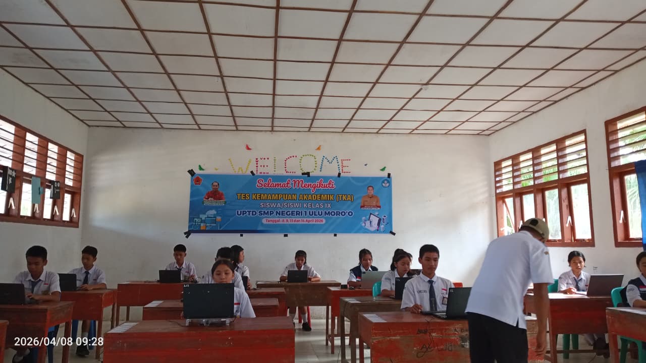UPTD SMP Negeri 1 Ulu Moro’o melaksanakan Ujian Tes Kemampuan Akademik (TKA) tingkat SMP yang berlangsung selama empat hari, yaitu pada tanggal 8 dan 9 April serta dilanjutkan pada tanggal 13 dan 14 April 2026. Kegiatan ini merupakan bagian dari upaya sekolah dalam mengukur capaian kompetensi akademik peserta didik secara menyeluruh.